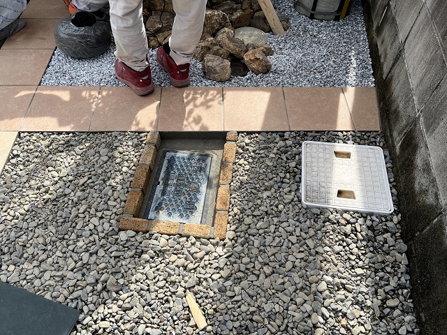 タイルテラスより低い位置にある量水器が