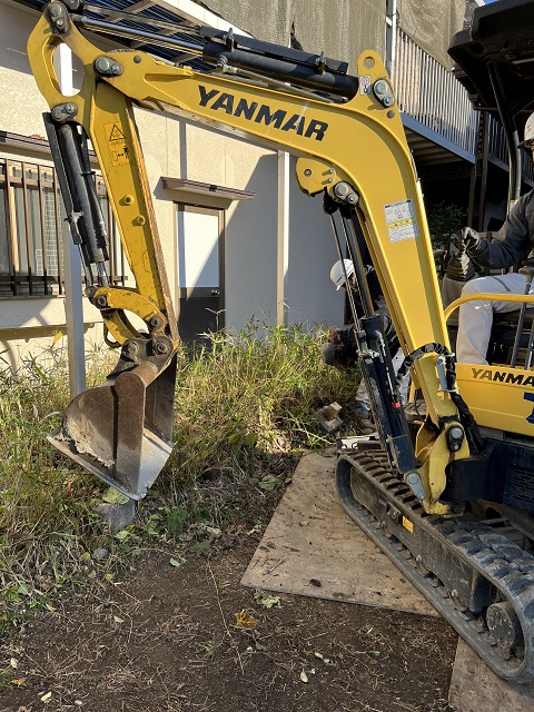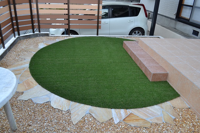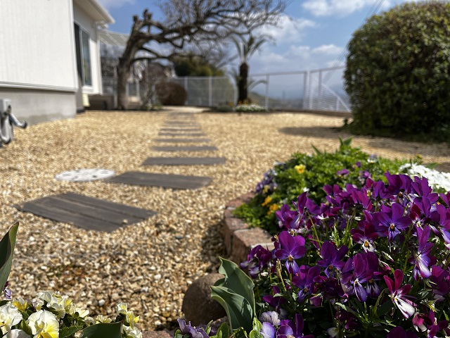 周囲には防草シートとカラー砂利『デコラストーンイエロー』を敷設し