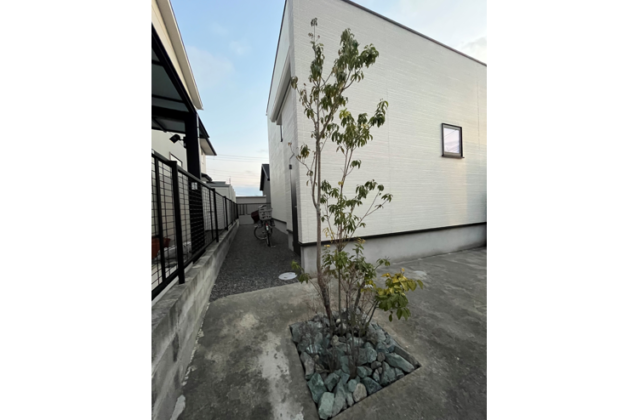 駐車スペースの隣地境界側に設けられていた既存の植栽スペースです。常緑ヤマボウシや低木は剪定し整え除草しました。こちらも門柱前の植栽スペース同様、株元に栗石を据付けます。栗石で飾ることで上品な景観となり、雨天時や水やりの際の水はねを防ぎます。また、水はけが良く雑草対策にもなります。イメージに合わせて株元に飾りを添えると植栽がぐっと引き立ちます。栗石以外にも鵜沼砕石やゴロタ石、ナチュラルな印象のバークチップ、下草やグラウンドカバーを植え季節ごとの変化を楽しむのもステキですね。可愛らしいお庭なら遊び心いっぱいの小人や動物、鳥などのガーデニングオーナメントをアクセントに飾り、お庭に物語のような雰囲気が生まれ、眺めるたびに楽しい気分になれますね。