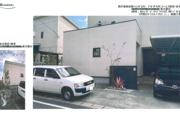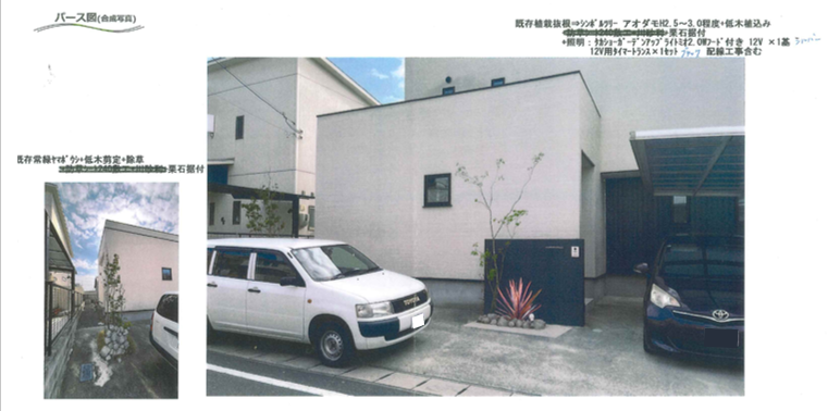 門柱前の植栽スペースに植えてある枯れた既存の植栽は抜根します。新たにシンボルツリーを植樹しライティングのご提案。駐車スペース隣地境界側の植栽スペースの植栽は剪定し整えます。