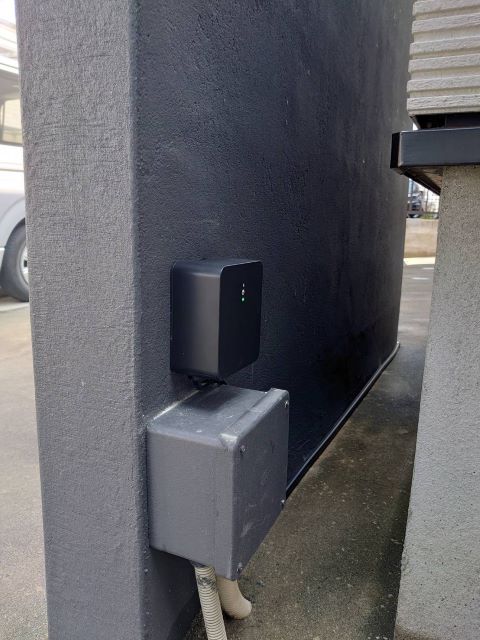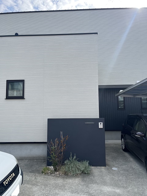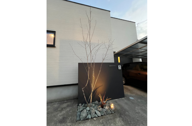 夕暮れ時、ライティングされたシンボルツリーがひと際目を引く熊本市中央区にお住まいのお客様邸のご紹介です。門柱前の植栽スペースに植えていた枯れた植栽は抜根しました。植栽が元気に育つように土壌改良を施し新たにH2.5m~H3.0程度のアオダモ(株立ち)をメインに低木コルジリネを添えて植え込みます。株元に栗石を据付けオシャレに演出。樹木を照らすためのライト『タカショーガーデンアップライトミオ』を設置します。ガーデンアップライトは樹種別によりライティングを最適な配光になるよう商品を選べます。家庭用コンセントは通常100Vですが、ガーデンライトは安全性を高めるため12Vで使う設計になっています。そのためトランス『Takasho 12Vタイマートランス』が100Vから12Vへと電圧を変換し、屋外でも安心して照明を楽しめるようにしています。また、タイマー機能により不要な電気代を抑えられます。トランスはコンパクト化し目立ちにくくスタイリッシュなデザインとなっています。(※サブ写真2 門柱裏側に取付)