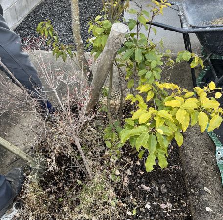 既存の常緑ヤマボウシ、低木は剪定し除草します。