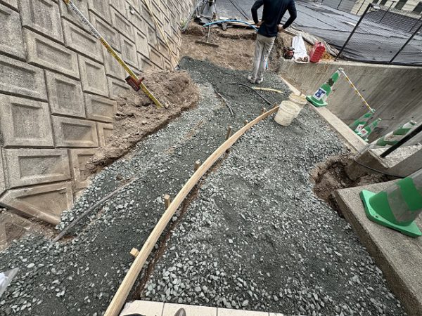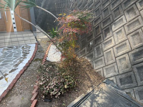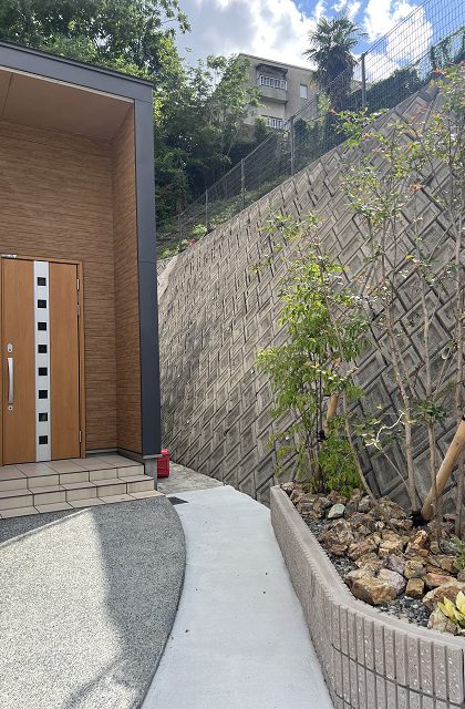 既存の花壇スペースを解体し化粧ブロック『オークス』を積工し立ち上げ花壇(レイズドベッド)としました。アプローチに沿ってアールを描いた形状とし歩行や自転車を押して通る場合もスムーズです。立ち上げ花壇(レイズドベッド)としたことで立体的になりメリハリのある空間となり、水はけ・風通しも良好です。黒土搬入後、常緑ヤマボウシやサルスベリ、低木類、下草類を植え雑草対策として防草シート+川砂利を敷いています。株元に鵜沼砕石を据付けます。自然素材でナチュラルな印象を演出しています。