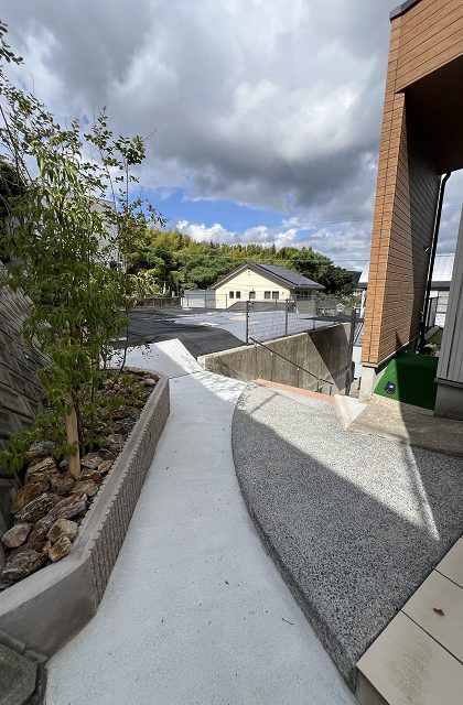 階段を上がりきると玄関まで簡易洗い出し仕上げのアプローチが導いてくれます。自然で温かみのある印象で、表面が硬化する前に表面のセメント部分だけを洗い流し、砂利などの骨材を露出させるため滑りにくい仕上がりとなっています。スロープは土間コンクリート打設をし刷毛引きで仕上げています。