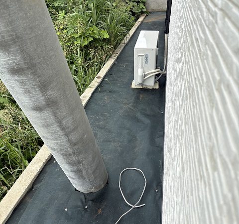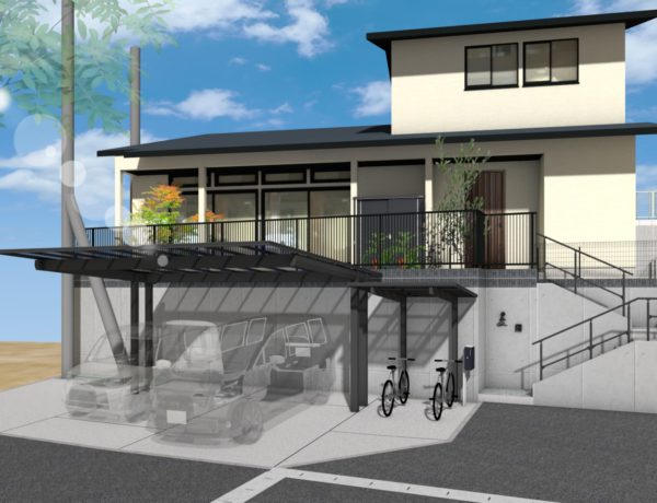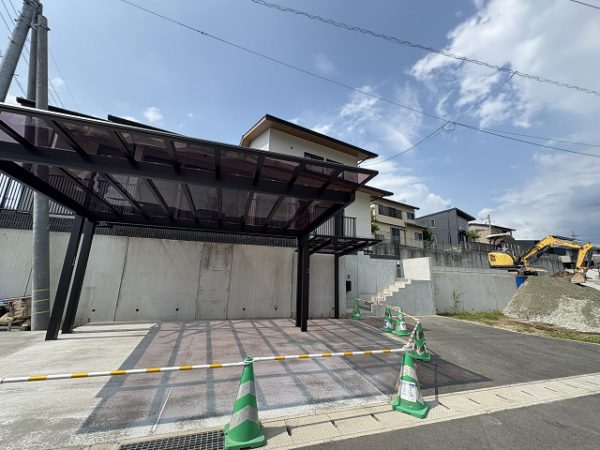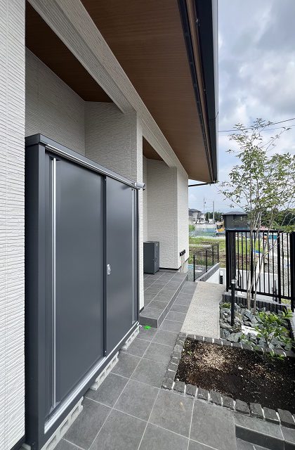 駐車スペースを3台分+駐輪スペースを確保し床面は土間コンクリート打設。西側、東側の境界へブロックフェンスを施工。建物周りは雑草対策を施しています。玄関横に物置の設置。シンボルツリーの植樹や菜園スペースの確保。