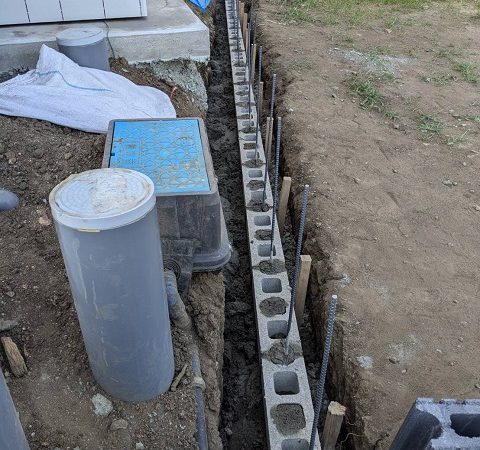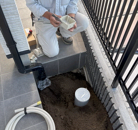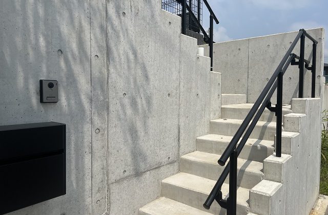 既存階段横の擁壁に転落を防ぐためブロックフェンスを施工します。擁壁をコア抜きし化粧ブロック『ネコ』を積みメッシュフェンス『三協アルミ ユメッシュHR型』を設置しました。既存階段には歩行者用補助手すり『三協アルミ エトランポ S1型』を取り付けます。2段笠木仕様を用いています。柱に対して2段の手摺りを設置でき、低い方はお子様が握りやすい高さに設置し、転落防止にもなっています。